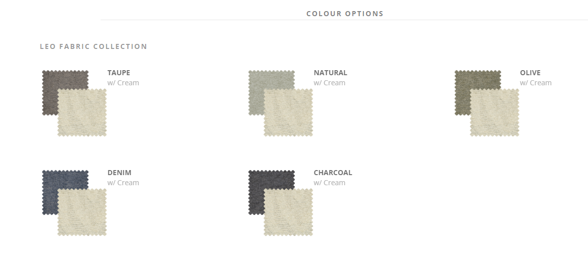 Taupe with Cream, Natural with Cream, Olive with Cream, Denim with Cream, Charcoal with Cream.