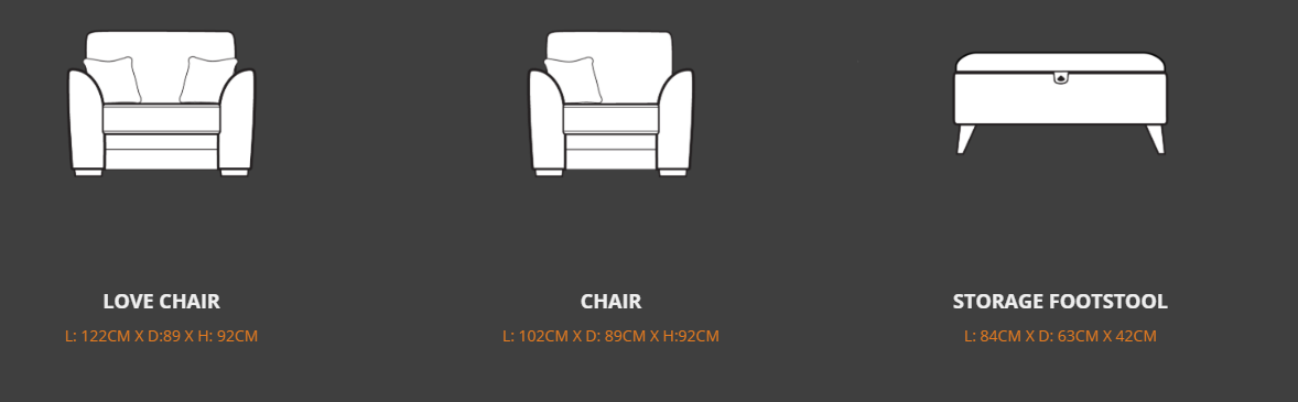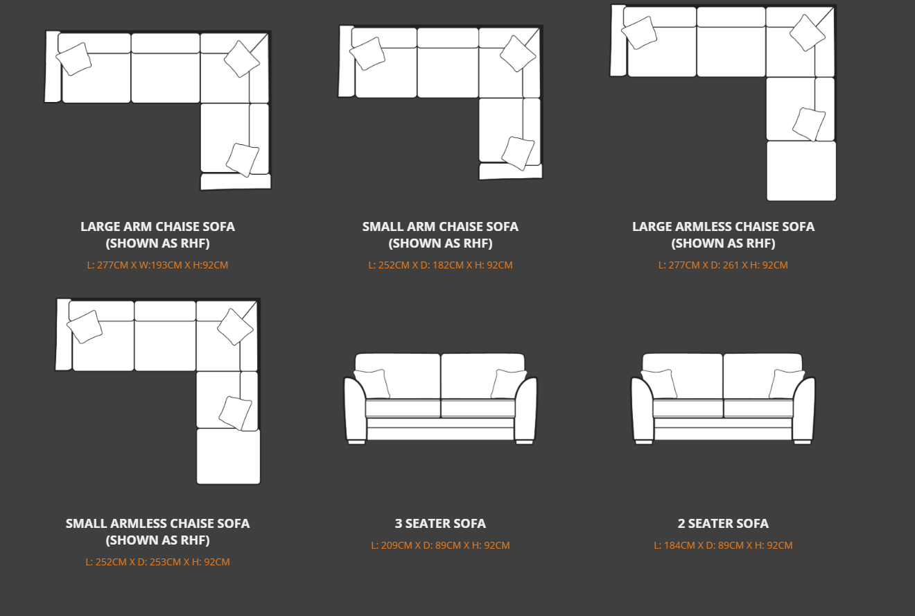 Available as: Small Armless Chaise Sofa, Large Armless Chaise Sofa, Small Arm Chaise Sofa, Large Arm Chaise Sofa, 3 Seater Sofa, 2 Seater Sofa, Chair, Lovechair, Footstool.
